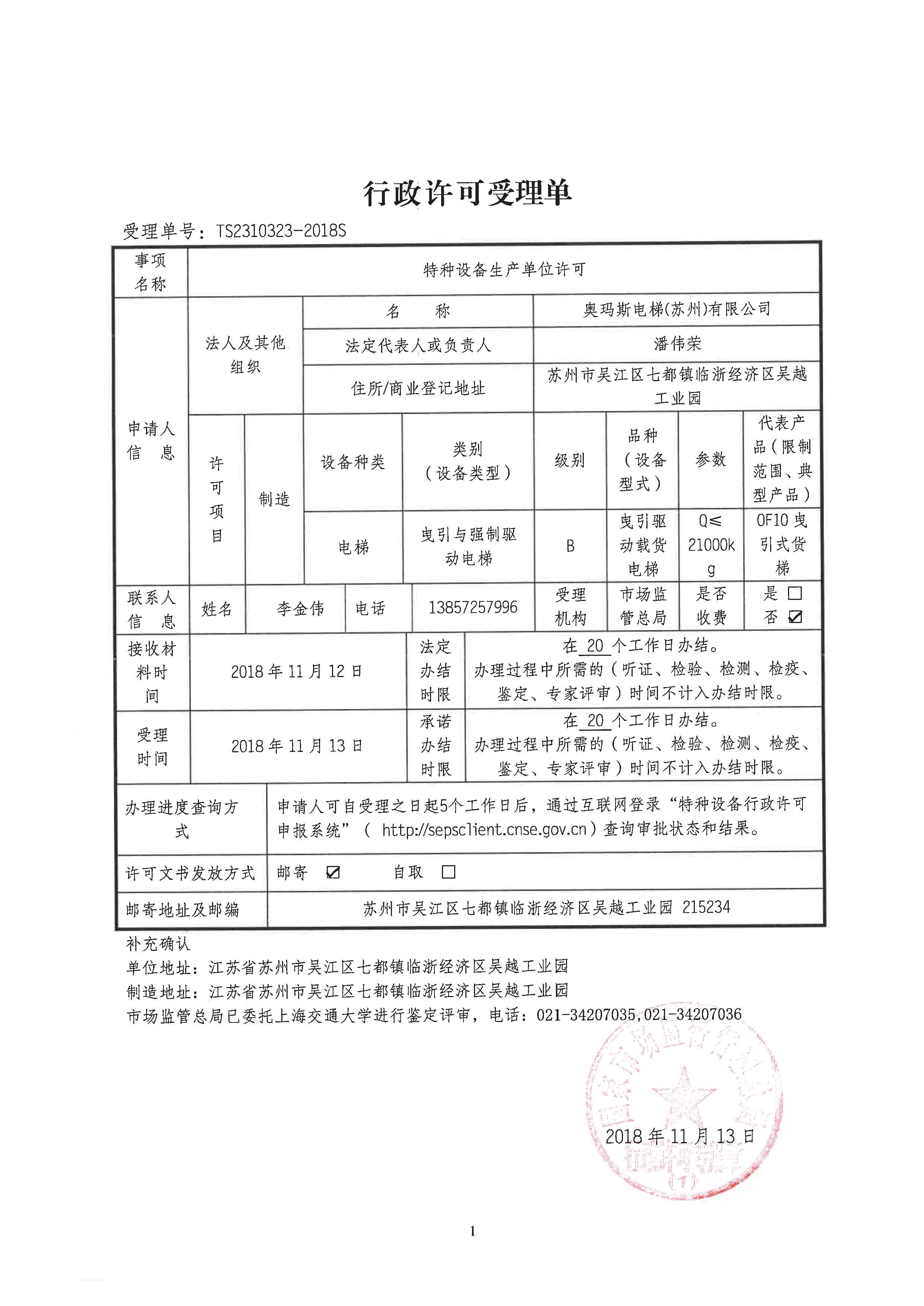 在载货类电梯一系列的大研发投入、及性价比高的好产品的相继推向市场。荣耀体育网页版官网的“回头客户”也越来越多,产品美誉度也越来越高。但荣耀体育网页版官网人永不自满,不会因此固步自封。在激烈的市场竞争面前,荣耀体育网页版官网人时刻保持着一份清醒与危机意识。所以只要有机会,荣耀体育网页版官网人就不会轻意放弃。2018年荣耀体育网页版官网公司根据中国电梯市场大吨位货梯的需求动向,果断接受常州某客户的要约,试制一台超大吨位的21T 速度0.33M/S的 6:1结构的载货电梯产品。目前该产品的试制许可申请已顺利通过国家市场监督管理总局的批准。(附“行政许可受理单”)
