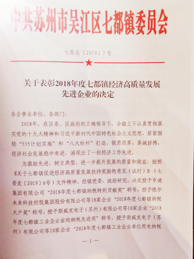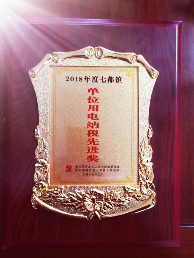 2019年2月14日,猪年初十,情人节。下午2:00时分,公司潘伟荣总经理从开会现场传来喜讯:荣耀体育网页版官网荣获“2018年度吴江七都镇单位用电纳税先进奖” (见下列获奖名单及奖牌) 及“2018度年吴江七都镇单位纳税百强企业”的殊荣。这种荣誉,荣耀体育网页版官网公司连续保持了4年。